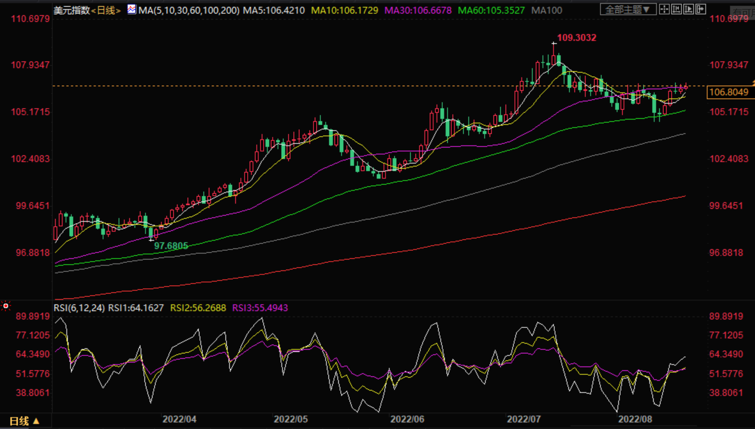 现在,美元指数上涨0.25%报106.93点,突破107.42点(联邦公开市场委员会7月27日后的周高点)将暴露109.29点(2022年7月15日的高点),然后是109.77点(2002年9月的月高点)。