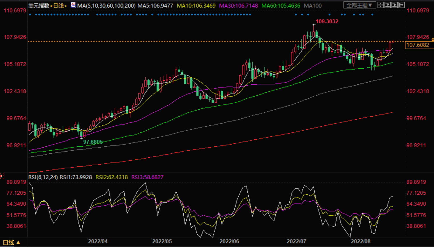 现在,美元指数上涨0.11%,至107.60点,突破107.72点(8月19日的月度高点)将会暴露109.29点(2022年7月15日的高点),然后是109.77点(2002年9月的月度高点)。