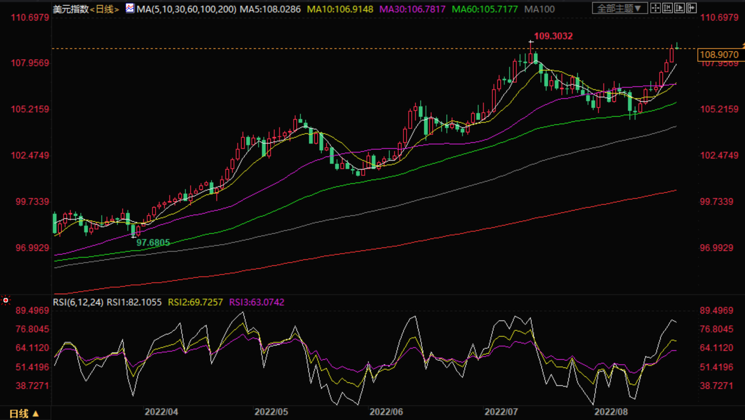 美元指数周二连续第5个交易日上扬,逼近周期高点109.30点,上次触及该区域是在2002年9月。