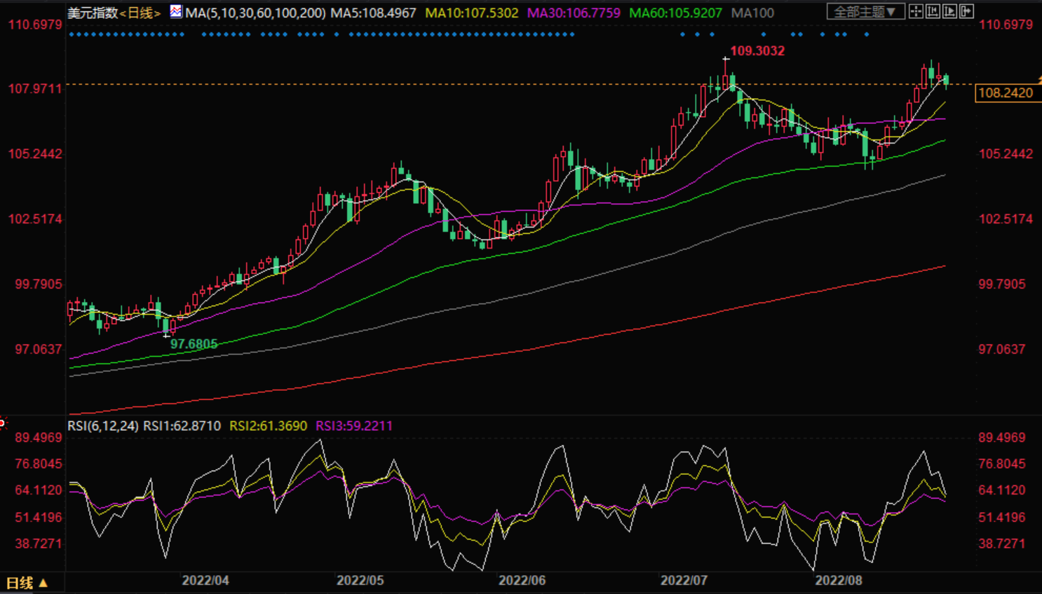 现在,美元指数在108.13点回落0.44%,并面临下一个支撑位107.99点(8月25日的周低点),其次是106.21点(55日移动平均线),然后是104.63点(8月10日的月低点)。