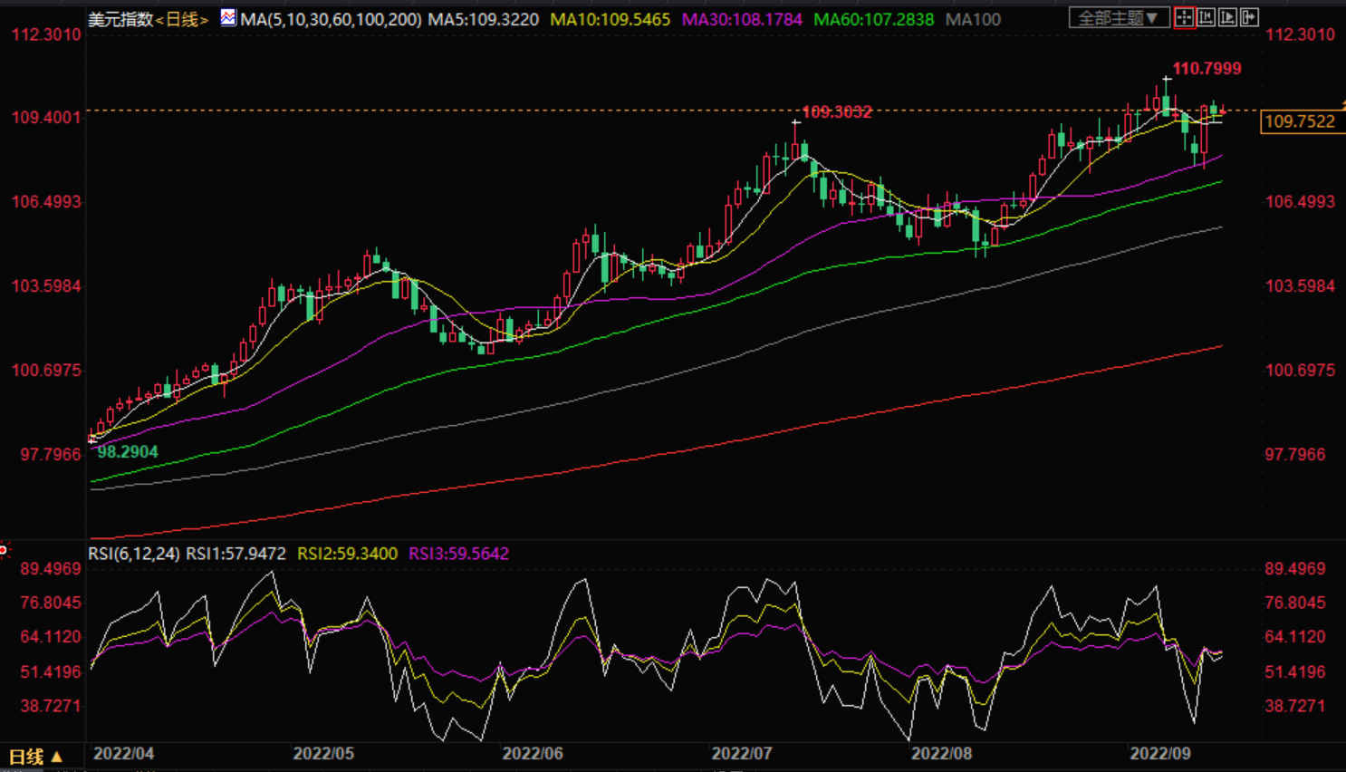 现在,美元指数在109.74处上涨了0.09%,如果突破110.01(9月13日的周最高价),将暴露110.78(2022年9月7日的最高价)和111.90(2002年9月6日的周最高价)。