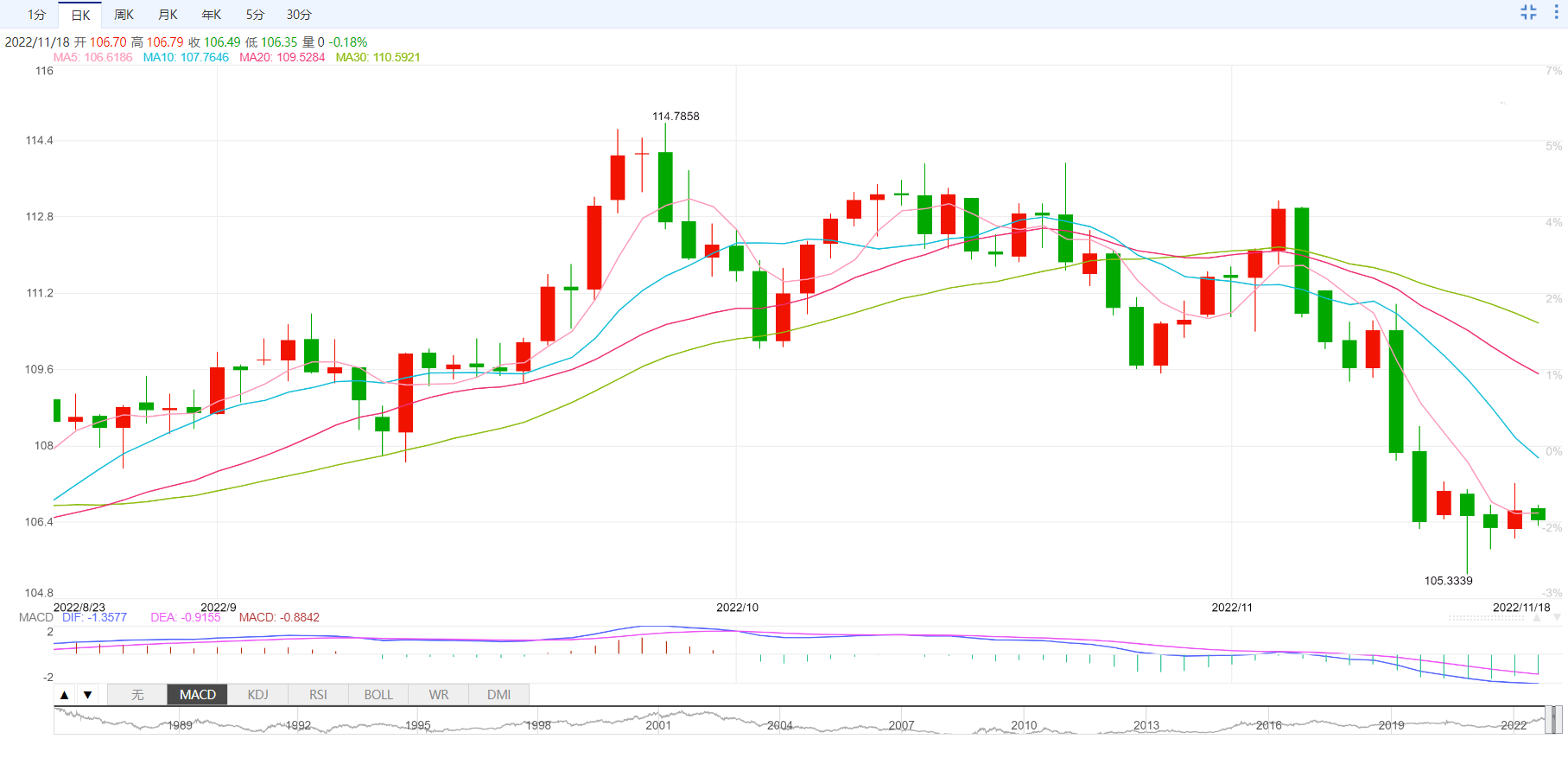 目前,美元指数在106.51处下跌了0.16%,如果跌破105.34(11月15日),将有可能达到105.05(200日移动平均线)和104.63(8月10日)。