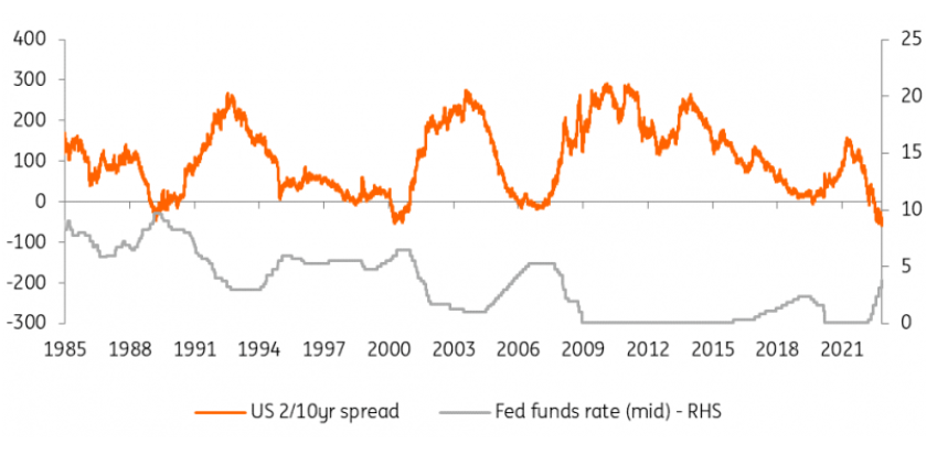 此外,这是在10年期国债收益率往往与基金利率在同一水平上达到峰值的情况下开始的,10年期国债收益率通常先达到峰值(而2年期国债收益率则在此之前达到峰值)。唯一的重大例外是上世纪70年代和80年代初的紧缩周期,当时基金利率被推至远高于10年期收益率的水平。