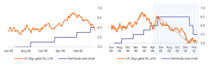 一旦联邦基金利率达到峰值,市场利率就会迅速下降(互联网泡沫破灭的例子)