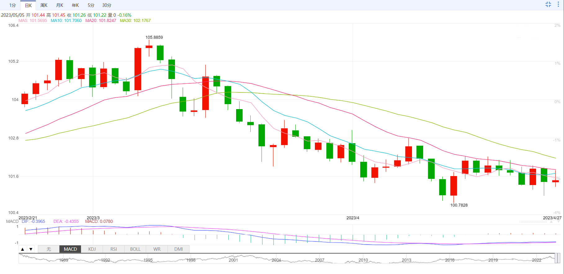 其他方面,2023年第一季度非农生产率和单位劳动力成本的初步数据喜忧参半。也就是说,第一季度非农生产率从市场预期的1.6%和-1.8%降至-2.7%,而单位劳动力成本从预期的5.5%和市场预测的3.3%跃升至6.3%。此外,美国商品和服务贸易平衡从之前的- 706亿美元和市场预测的- 633亿美元改善至- 642亿美元。此外,4月28日当周初请失业金人数小幅上升至24.2万人,预期为24万人,前值为22.9万人。