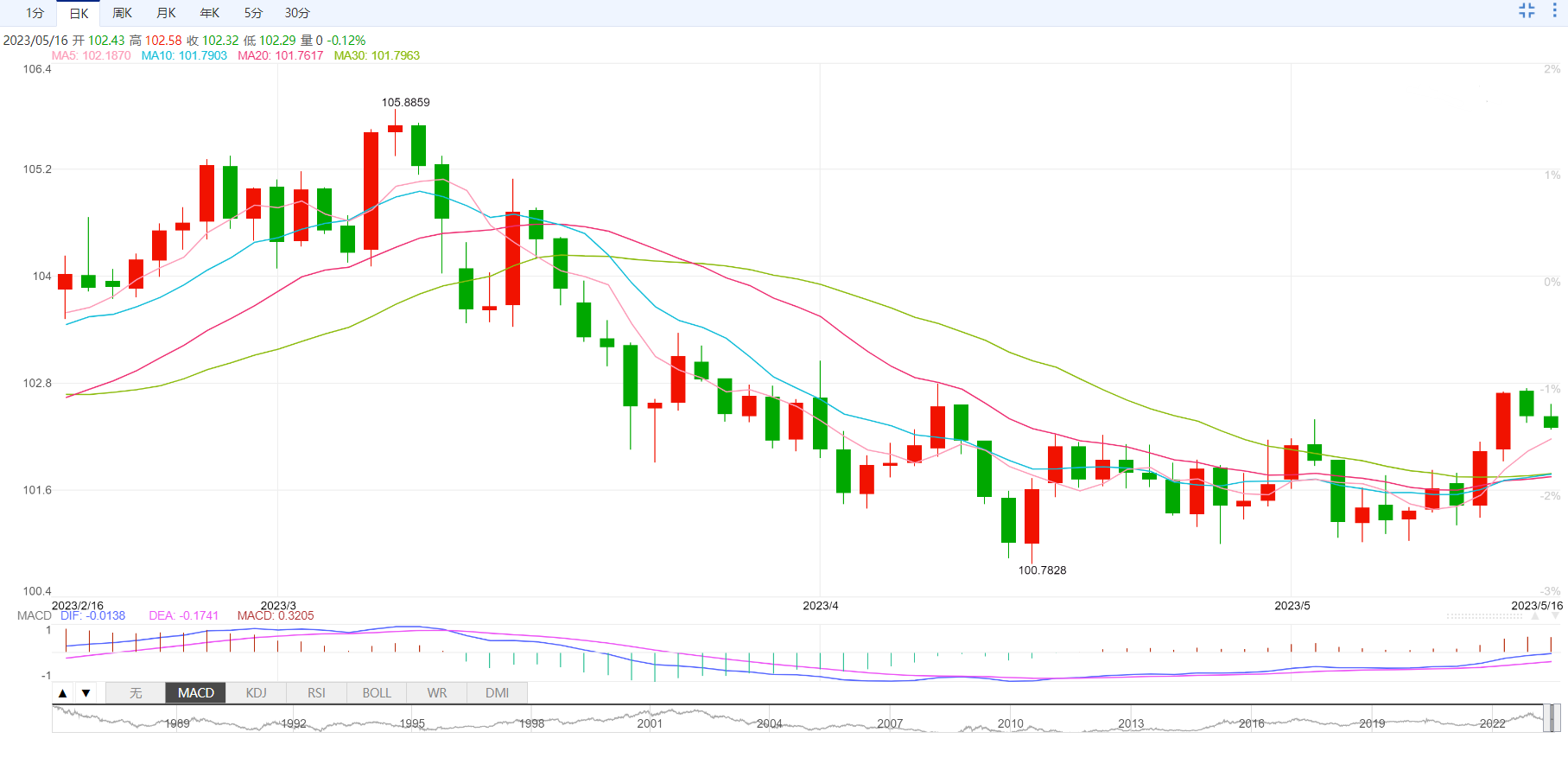 现在,美元指数下跌0.06%至102.35,并面临下一个支撑位101.01(4月26日的周最低价),然后是100.78(2023年4月14日的最低价),最后是100.00(心理水平)。