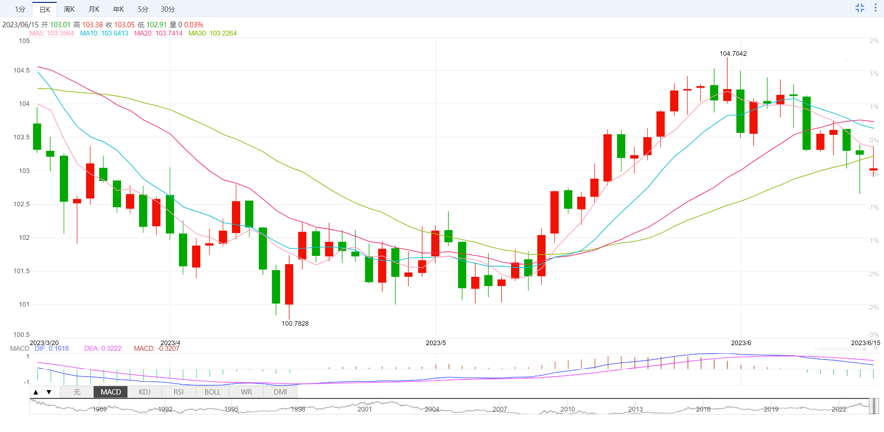 现在,美元指数上涨0.14%至103.14,突破104.69(5月31日的月高点)将打开通往105.32(200日移动均线)和105.88(2023年3月8日的高点)的大门。