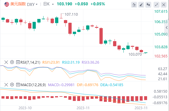 目前,美元指数下跌0.02%,报103.17点,短期支撑在103.07(11月28日的月度低点),然后是102.93(8月30日的周度低点)和100.00的心理关口。上行方面,突破104.21(11月22日的周线高点)后,可能会升至106.00(11月10日的周线高点),最后是106.88(10月26日的周线高点)。