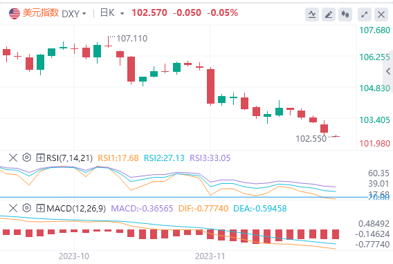 美元指数跌至102.70点以上的三个月低点,在周三市场交易日前的一周下跌了零点六个百分点。