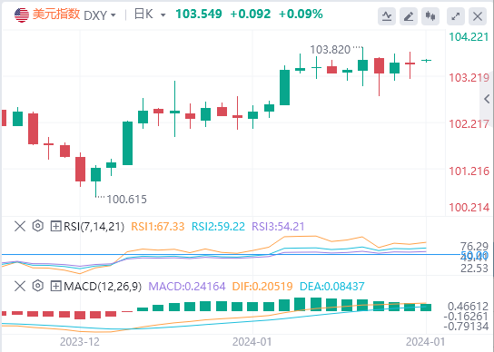 从美元指数日线图来看,预计近期阻力位于年内高点103.81(1月23日)附近。重要的200日简单移动均线(SMA)103.49附近构成支撑。进一步上行后,目标处在12月份高位104.26(12月8日和11日),然后是100日均线104.31。如果美元指数突破这一水平,继突破周线高位106.10(11月10日)后,可能会向11月份的最高点107.11(11月1日)攀升。