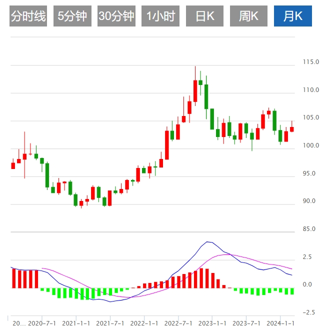 2024年2月美元指数整体呈现上涨趋势。截止发稿,美元指数徘徊于103.78附近,月累计上涨0.16%。2月13日、2月14日美元指数最高到104.97附近,逼近105关口,随后回落,徘徊于104关口上下。2月14日市场情绪发生了重大转变,对下个月利率不变的预期飙升至93%,与一个月前形成鲜明对比。投资者现在正在考虑美联储(Fed)在6月份降息的可能性。美国1月份通胀意外上行,促使德国商业银行(Commerzbank)分析师重新评估美联储转向降息的可能性。观察人士猜测,美联储此前计划在5月降息,现在是否可能面临不确定性。与此同时,美国国债收益率曲线均触及数周高点。