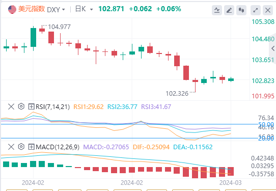 3月14日,美元指数小幅上涨0.09%,报102.87。这一走势使其略高于其枢轴点102.72,暗示了潜在的看涨情绪。需要关注的关键阻力位在103.13、103.31和103.60。