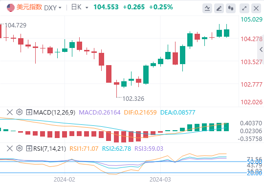 美元相对强弱指数(RSI)在60左右小幅上涨,而移动平均线趋同背离(MACD)则呈现绿色条形,表明存在看涨势头。然而,当前的买盘动力能否刺激美元指数升至更高水平还有待观察,因为MACD也暗示上涨潜力有限。