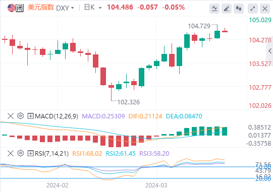 美元指数的第一个关键水平104.60,上周涨势见顶,已被打破。再往上走,104.96仍然是要突破105.00的水平。一旦高于该水平,105.12是相对强弱指数(RSI)在超买水平交易之前的最后一个阻力点。