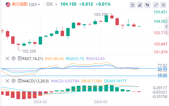 美元指数小幅上涨0.02%至104.137。它现在测试枢轴点103.92,表明有向上运动的潜力。阻力位设定在104.42、104.70和105.09,表明价格上涨可能达到上限。