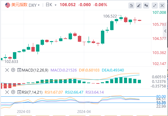 如果多头继续走强,美元指数可能会触及2024年高点106.51(4月16日)。若突破该水平,可能会提振美元指数在触及2023年最高点107.34(10月3日)之前,开始可能会测试11月份最高点107.11(11月1日)。