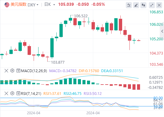 日线图上的技术指标反映了美元指数的混合信号。相对强弱指数(RSI)的负斜率和负区域表明空头似乎正在取得进展。移动平均收敛散度(MACD)上升的红色柱线进一步证实了这一趋势,这表明看跌势头。