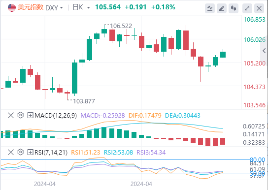 美元指数上涨0.16%至105.50,徘徊在关键点105.41上方。关键阻力位在105.89美元、106.15美元和106.48美元,而初步支撑位在105.04美元。
