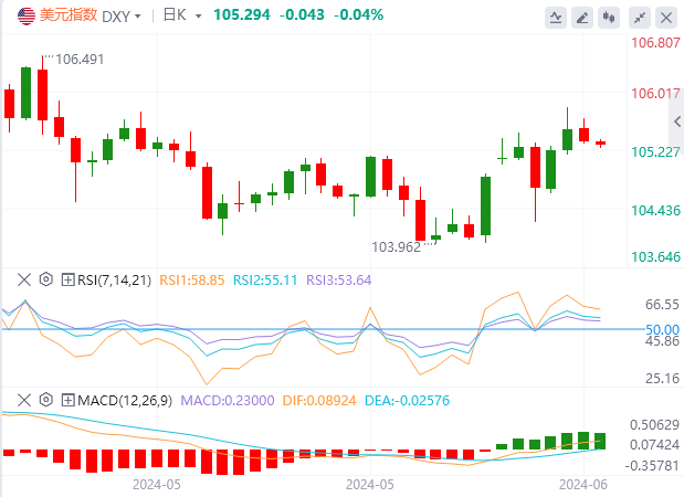 美元指数技术指标在周一的交易中呈现停顿,但总体上保持积极态势。相对强弱指数(RSI)继续保持在50水平之上,移动平均线收敛散度(MACD)继续呈现绿色条形。这意味着多头仍然强劲,为进一步上涨留下了空间。