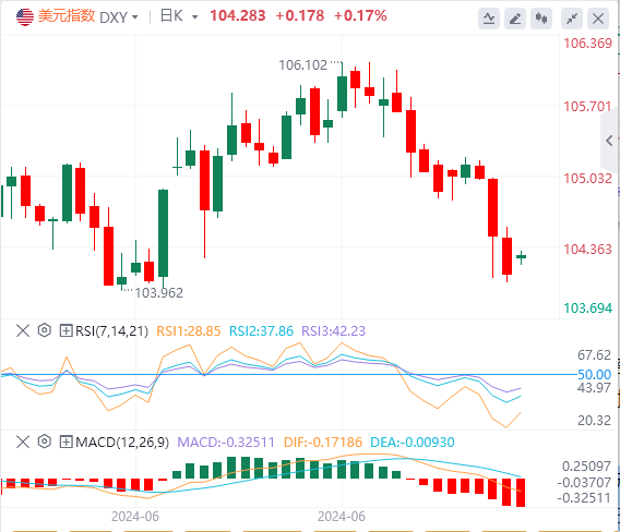 上周五美元指数震荡下行,日线小幅收跌,现汇价交投于104.30附近。日前美国表现疲软的CPI数据影响发酵,美联储9月份降息预期重燃是施压美元指数持续回调的主要原因。不过,104.00关口附近所形成的技术面买盘和时段内整体表现良好的经济数据限制了汇价的下跌空间。今日104.80附近的压力情况,下方支撑在103.80附近。
