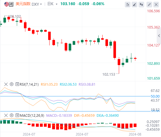 然而,随着全球股市在近期动荡后进一步回升、日元表现正常化以及波动性略微稳定,美元指数在103.50附近的看涨走势似乎已经乏力。