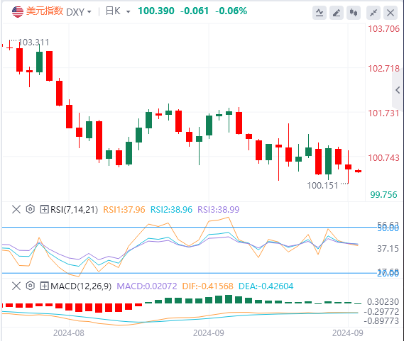 支撑位分别位于100.50、100.30和100.00,阻力位分别位于101.00、101.30和101.60。该指数无法突破101.00水平表明下行势头可能在短期内持续。