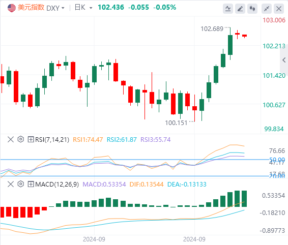 美元指标在上周上涨后有所回落,指数结束了连续五天的上涨趋势。相对强弱指数(RSI)和移动平均收敛散度(MACD)稳固地处于正值区域,还有进一步上涨的空间。