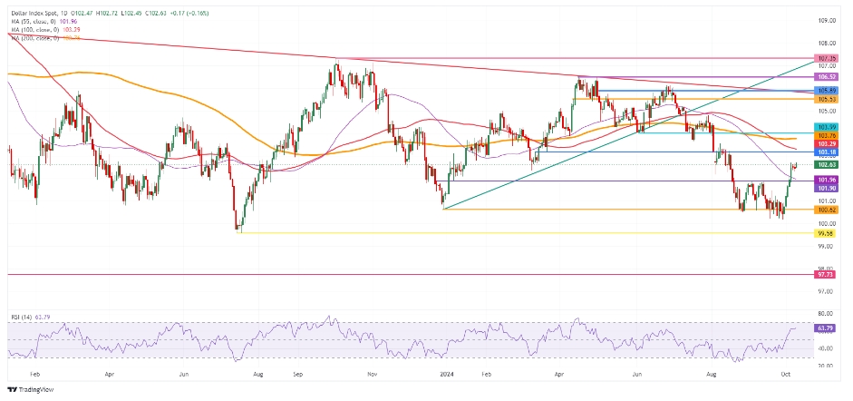 美元指数 (DXY) 创下历史新高,回到 9 月的高位,并有望走高。由于几个关键水平非常大的区域略高于 103.00,问题是这次反弹能走多远。考虑到相对强弱指数 (RSI),测试 103.18 似乎是可能的,但 104.00 似乎是不可能的。