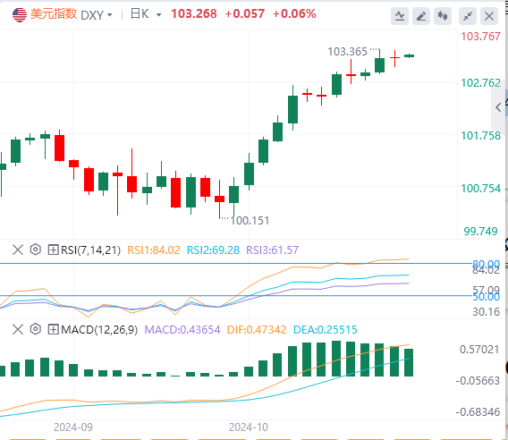 美元指数的技术分析显示,市场前景乐观,各项指标正在增强势头。该指数已突破100日移动平均线,并正在接近200日移动平均线103.80,这将是一个关键阻力位。不过,相对强弱指数(RSI)和移动平均线收敛散度(MACD)指标发出超买信号,表明可能出现获利回吐。