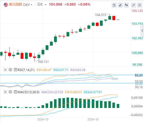 关键支撑位包括104.50、104.30和104.00,阻力位位于104.70、104.90和105.00。