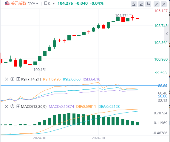 尽管周末有所上涨,但指标仍接近超买区域。支撑位在104.50、104.30和104.00,阻力位在104.70、104.90和105.00。