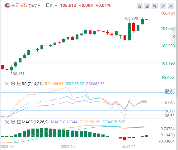美元指数周一突破关键阻力位105.50,达到7月份以来的水平。技术指标仍处于正值区域,支撑了这一看涨走势。