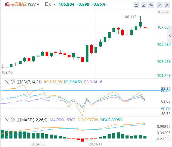 下行方面,若出现回调都将首先在关键的200日均线(目前位于103.96)处遇到支持,然后是11月低点103.37(11月5日)。进一步下跌可能会测试分别位于103.30和103.16的55天和100天均线。更大幅度的回落甚至可能使该指数更接近9月27日录得的2024年低位100.15。
