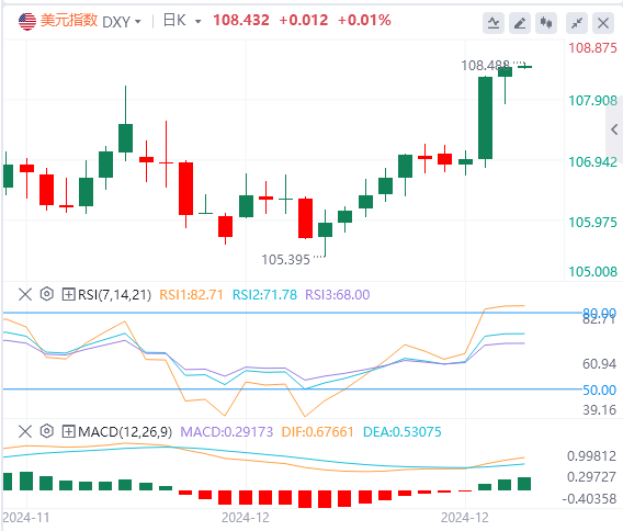 美联储的货币政策声明指出,经济活动保持强劲,同时注意到劳动力市场状况有所缓和。美联储的经济预测摘要(SEP)或“点阵图”预测2025年仅有两次降息,低于9月份预测的四次降息。