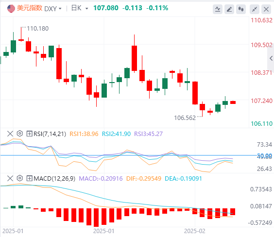 美元指数维持在107上方小幅上涨,但上行动能依然有限。尽管有所反弹,但20日简单移动平均线(SMA)在上周失守后仍是关键阻力位。相对强弱指数(RSI)继续在看跌区域徘徊,而移动平均线收敛散度(MACD)则反映出稳定的下行压力。跌破100日移动平均线106.30将强化短期负面前景。多头需要更强劲的势头来挑战107.50阻力位并建立更持久的复苏。