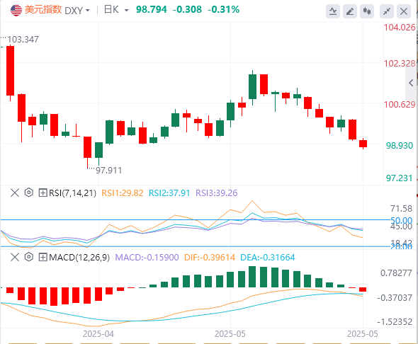 由于美元兑风险较高的资产以及日元和瑞士法郎等避险资产下跌,美元指数当日贬值0.3%,较5月初的高点下跌近3%。由于美国市场在银行假日休市,交易量可能会保持清淡。