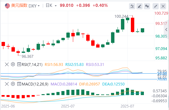在4小时图上遵循上升趋势线,维持自7月23日以来的一系列更高低点。在从100.25高点大幅下跌后,该指数已稳定在50日均线(98.82)和100日均线(98.51)上方,两者现在都是直接的动态支撑。