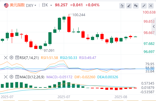美元指数徘徊在一周高点附近,因为在7月生产者价格指数(PPI)数据高于预期后,交易员减少了对美联储9月会议降息的押注。根据CMEFedWatch工具,交易员目前预计美联储在9月17日降息25个基点的可能性接近80%,并预计今年剩余时间总共降息52个基点(bps)。周三,下个月降息的可能性为83%。