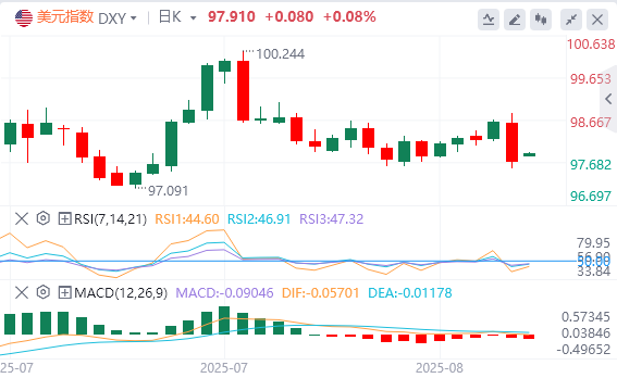 8月25日,美元指数徘徊在97.91附近。此前美联储主席杰罗姆·鲍威尔表示最早可能在9月联邦公开市场委员会会议上考虑降息。鲍威尔在杰克逊霍尔举行的美联储年度研讨会上发表讲话时承认劳动力市场下行风险不断增加,促使交易员重新调整对美联储利率路径的预期。