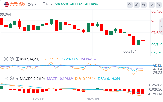 美元指数交投于96.99附近,在97.25阻力位被拒绝后下滑。该指数仍低于50日均线(97.33)和200日均线(97.85),强化了看跌势头。