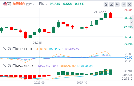 美元指数在99.33遇阻回落,100整数关口形成强压力位。美联储理事沃勒周五重申“谨慎宽松”立场,强化了降息预期,但100关口阻力仍稳固。若缺乏新的经济数据或美联储鹰派信号,美元短期上行空间受限。技术指标显示,周线级别美元指数仍处调整通道,需突破100关口方可打开进一步上行空间,否则可能延续区间震荡。