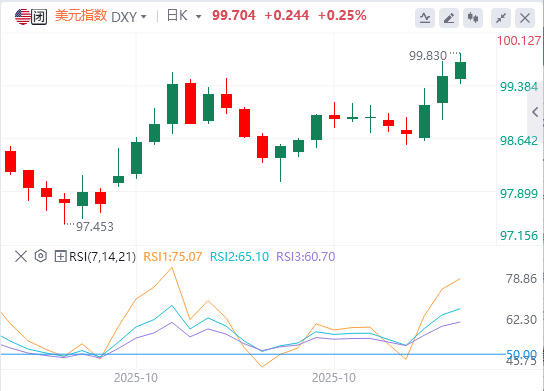 当前美元指数仍运行于200日(100.49)和200周(103.29)均线下方,维持中期偏空前景。若突破100.00关口,后续阻力位依次为8月高点100.26、5月高点101.97;支撑位则关注10月低点98.03及2025年底部96.21。技术指标显示短期上涨动能充足:RSI升至66上方,ADX接近20,暗示趋势加速可能。