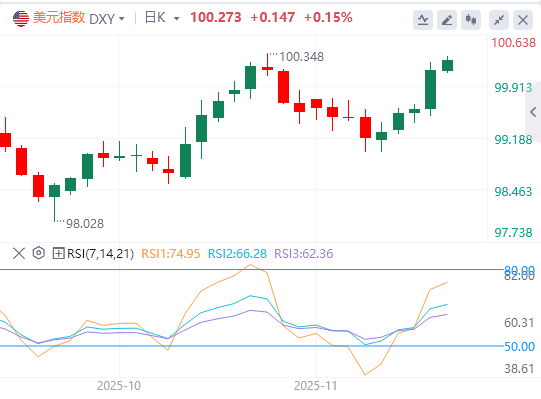美元在前一交易日上涨超过0.5%,接近11月5日达到的五个月高点100.36,市场在最新的联邦公开市场委员会(FOMC)会议纪要发布后,降低了对12月美联储再次降息的预期。