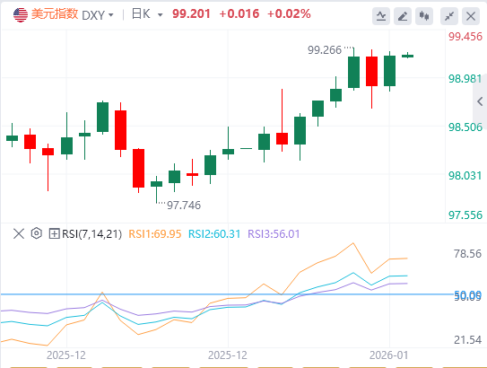 或许阻碍多头突破的是99.072至99.384的回撤区间。目前,该指数正处于该区间。如果持续跌破99.072下方,盘中可能会出现一些走弱。另一方面,99.384的上方水平可能成为加速向上的触发点。