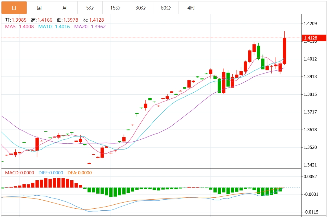 美元/加元周二交投于1.4080左右,此前当日上涨了四分之三。汇率已跃升至多年区间顶部上方,并有望走高。在当选总统唐纳德·特朗普(DonaldTru)发表将对加拿大(和墨西哥)进口商品征收25%关税的言论后,加元(CAD)兑美元(UD)迅速贬值后,该货币对已从周二亚洲时段达到的峰值1.4178回落。 此举可能会减少对加拿大