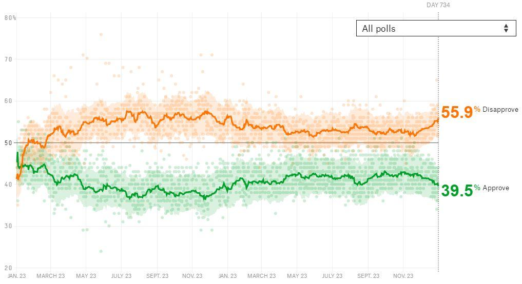 图片来源:Fivethirtyeight,截止2019年1月23日,绿线为特朗普支持率、橙线为特朗普反对率。