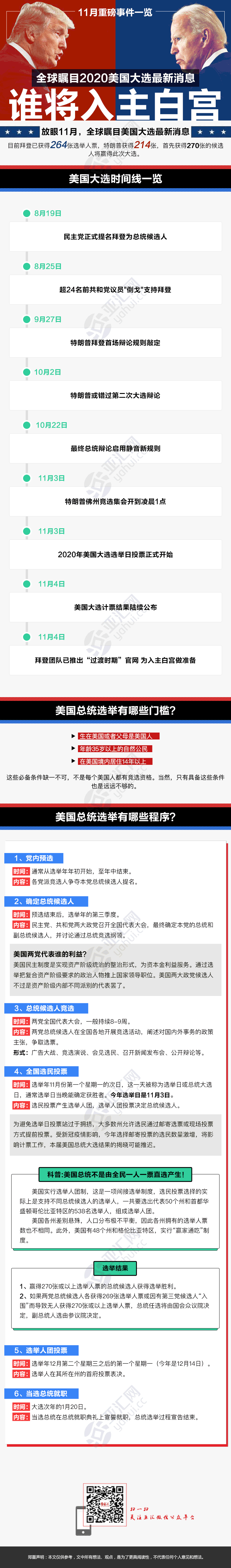 目前拜登已获得264张选举人票,特朗普获得214张,首先获得270张的候选人将赢得此次大选。