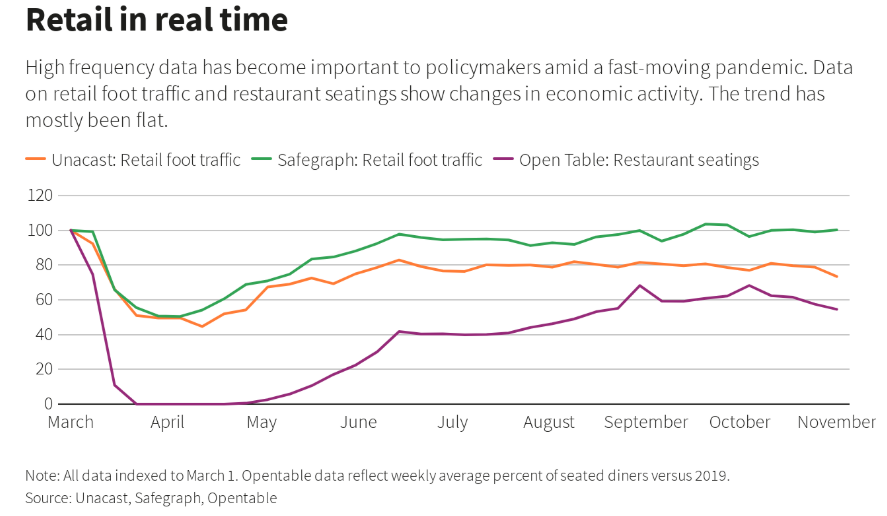 手机追踪公司Safegraph的数据则显示,零售场所的客流量充其量保持稳定。