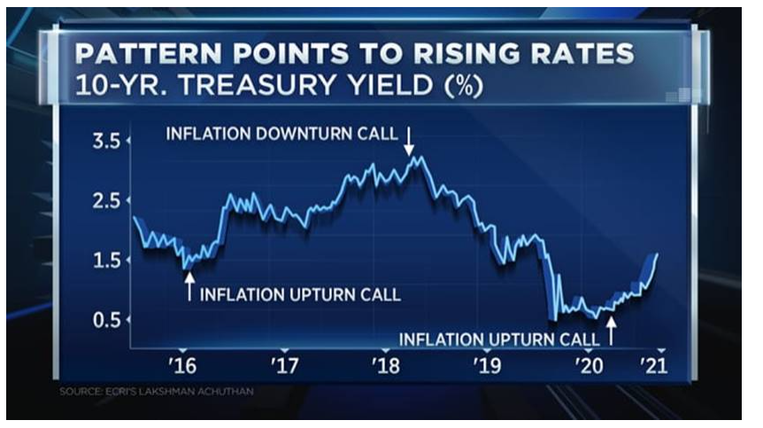 Achuthan用一张10年期国债收益率的图表来支持他看涨通胀的观点。它显示了过去5年的收益率,包括他做出通胀上行和下行周期的预测时间。