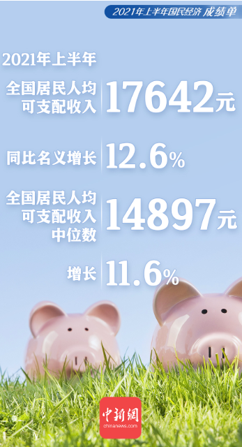 7月15日,国家统计局公布上半年中国经济数据。居民收入继续增长,城乡居民人均可支配收入比值缩小。上半年,全国居民人均可支配收入17642元,同比名义增长12.6%,这主要是受到去年上半年低基数的影响,两年平均增长7.4%,比一季度加快0.4个百分点;扣除价格因素同比实际增长12.0%,两年平均增长5.2%,略低于经济增速,基本同步。全国居民人均可支配收入中位数14897元,增长11.6%。